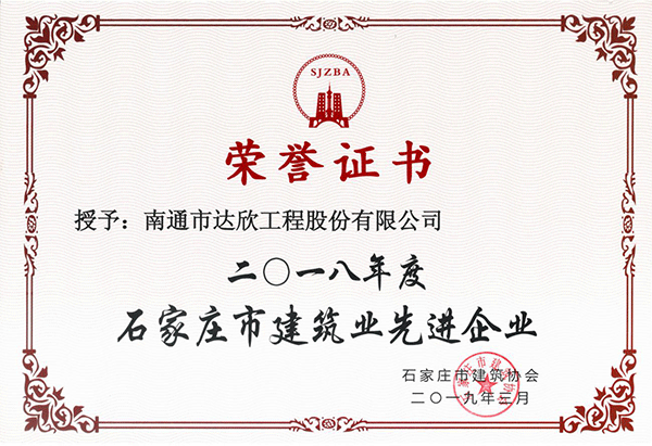 我司被石家莊市建筑協(xié)會(huì)評(píng)為“2018年度石家莊市建筑業(yè)先進(jìn)企業(yè)”同時(shí),楊靜同志評(píng)為“2018年度石家莊市建筑業(yè)優(yōu)秀企業(yè)經(jīng)理”,劉紅強(qiáng)同志被評(píng)為“2018年度石家莊市建筑業(yè)優(yōu)秀項(xiàng)目經(jīng)理”,被河北省建筑業(yè)協(xié)會(huì)評(píng)為“2018年度河北省建筑業(yè)先進(jìn)企業(yè)”、“河北省建筑業(yè)AAA級(jí)社會(huì)誠(chéng)信企業(yè)”,這是我司連續(xù)多次獲此殊榮;同時(shí),徐仁忠、楊靜同志被評(píng)為“2018年度河北省建筑業(yè)優(yōu)秀企業(yè)管理者”,傅海榮同志被評(píng)為“2018年度河北省建筑業(yè)優(yōu)秀總工程師”。