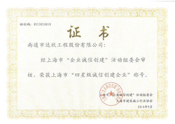 日前,由上海市建筑施工行業(yè)協(xié)會推薦,上海市“企業(yè)誠信創(chuàng)建”活動組委會審核,第三方征信機構(gòu)嚴格查證,第一工程公司在2013年榮獲“三星級誠信創(chuàng)建企業(yè)”后,今年再加一顆星,被授予上海市“四星級誠信創(chuàng)建企業(yè)”稱號。