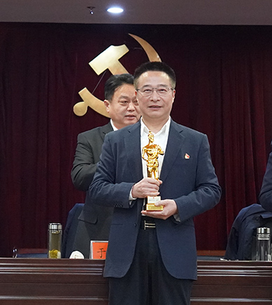 會上,集團黨委書記劉厚純上臺接受表彰,領(lǐng)取了黨建“魯班獎”小金人獎杯。