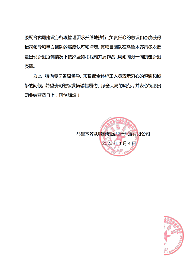 1月10日,集團(tuán)公司收到來(lái)自烏魯木齊眾城宏展房地產(chǎn)開(kāi)發(fā)有限公司的一封表?yè)P(yáng)信,信中對(duì)集團(tuán)第十一公司烏魯木齊碧桂園·黃金時(shí)代二期工程項(xiàng)目部2022年8月10日烏魯木齊市實(shí)施新冠疫情防控以來(lái),項(xiàng)目部全體人員在疫情防控和項(xiàng)目建設(shè)中表現(xiàn)出的責(zé)任與擔(dān)當(dāng)表示感謝。內(nèi)容詳見(jiàn)附件: