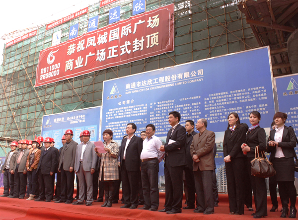 在4月15日的裙樓封頂儀式上,唐山天壤房地產開發(fā)有限公司闞春鳳董事長首先向全體參建人員表示衷心的感謝,對達欣公司在工程建設中所做的努力給予高度評價和充分肯定,她在最后致詞中堅信:在達欣股份等諸多品牌公司的通力協(xié)作之下,在全體參建人員的共同努力下,鳳城國際廣場項目一定會如期完成。