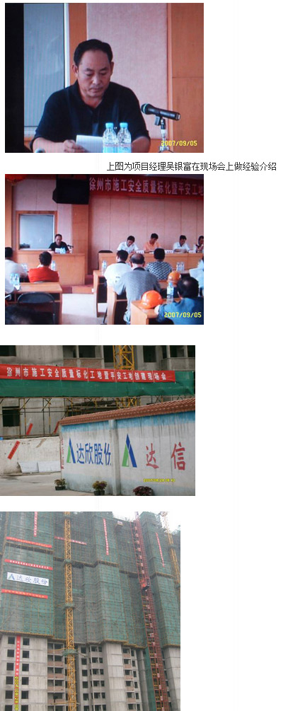 大會上吳經理的發(fā)言得到了大家一次又一次的掌聲,建設局安監(jiān)處王處長最后對這次的現場會作了很高的評價。通過這一次的活動,極大的提高了“達欣股份”在徐州建筑市場的知名度,為“達欣股份”進軍強手之林奠定了基石,提升了我們的品牌形象。