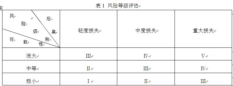 在對危險源識別的基礎上,評估危險源造成風險可能性和大小,對風險進行分級,對不同等級風險采用相應的風險控制措施。風險等級評估:Ⅰ級為可忽略風險;Ⅱ級為可接受風險;Ⅲ級為中度風險;Ⅳ級為重大風險;Ⅴ級為不容許風險,如表1。